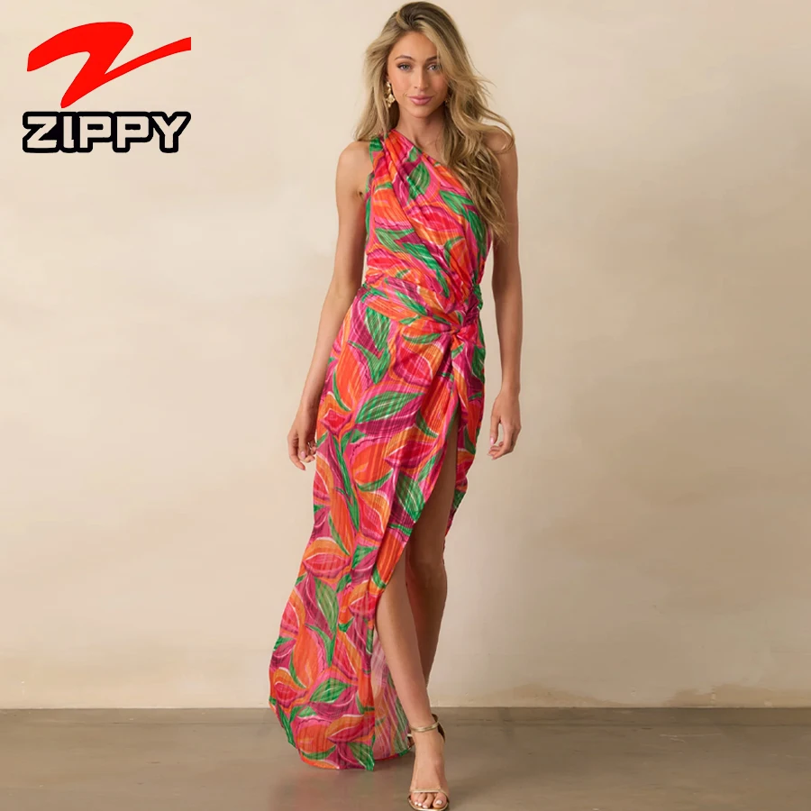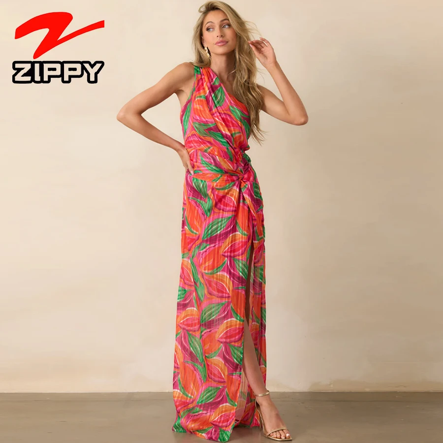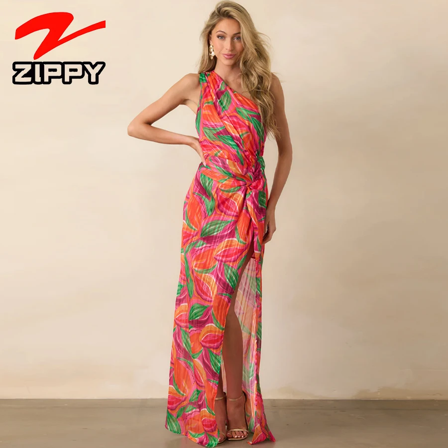 Customize Fashion One-Shoulder Maxi Dress Tropical Print High Slit Design Long Dress Summer Casual Beach Vacation Dress